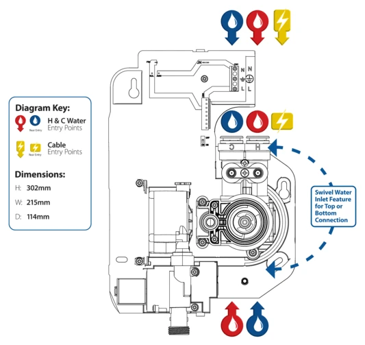 - Ease of installation – Multiple cable and water entry points and large footprint makes an ideal replacement for existing Triton power shower installations