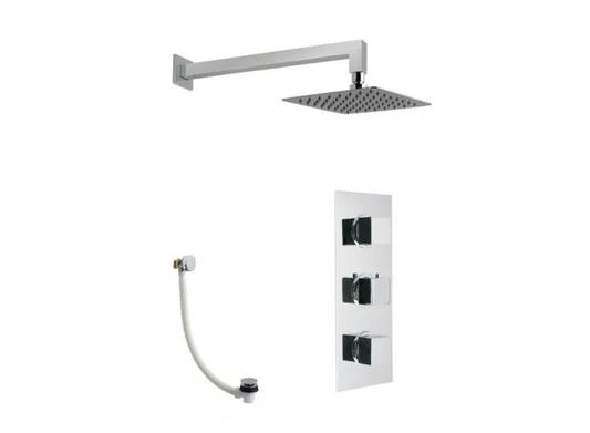 Vado Mix Concealed 3 Handle Thermostatic Shower Valve, With Rectangular Back Plate (Includes Fittings For 1/2″ And 3/4″ Pipework), Aquablade 200Mm Square Shower Head With Shower Arm And Bath Filler Waste And Overflow – Mix-1740-C/P